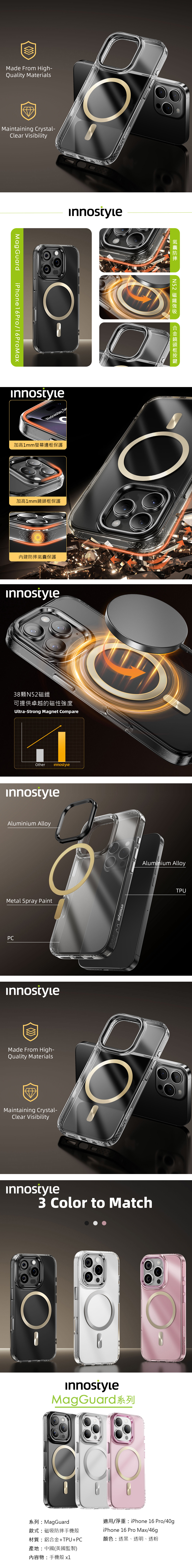 innostyle MagGuard系列 iPhone 16 Pro Max 高清磁吸防摔手機殼 透黑