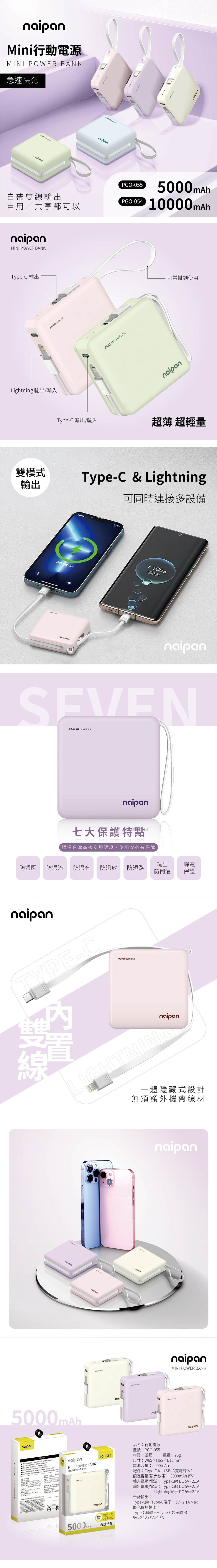 naipan 5000mAh 自帶雙線Lightning/Type-C快充行動電源 小方塊